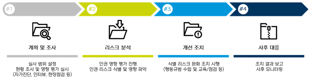 넥슨게임즈는 인권에 대한 실질적 또는 잠재적 영향을 파악하고, 이를 예방, 완화 및 해결하기 위해 노력합니다. 인권 리스크 실사 프로세스는 아래와 같은 절차로 진행됩니다.